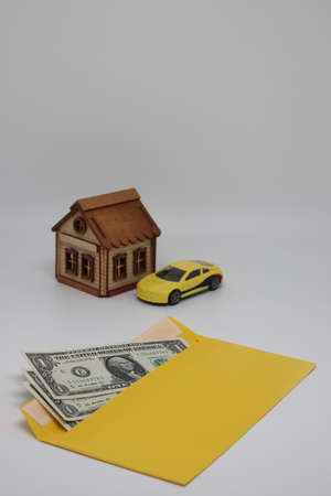 Yellow envelope with banknotes on the background of a toy house and a car, plans for the future