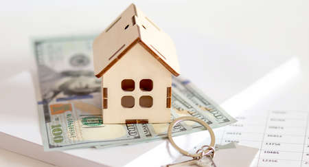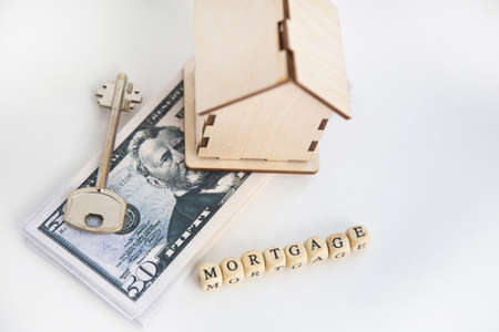 mortgage, loan and home purchase. Model of house, dollar bills, key on white isolated background. Free space for text
