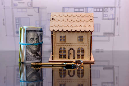 Loan or save for buy a house and real estate concept. Mortgage loading and calculator property document concept. wooden house stands with key and dollars.