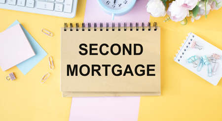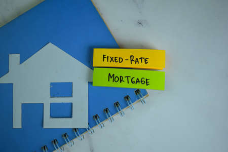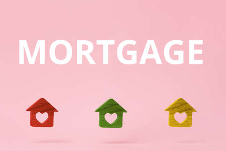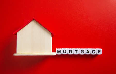 Mortgage word and wooden house. Home insurance. Rent, buy house.