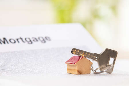 House keys with word mortgage from wooden blocks, property purchase investment and financial real estate concept