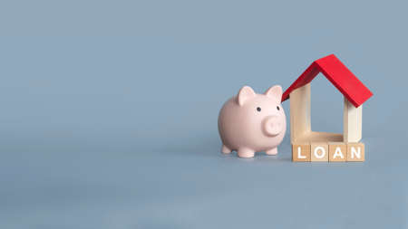 A house model, piggy bank and wooden cube written with LOAN isolated on grey background with copy space.