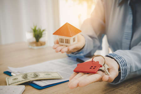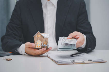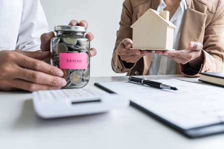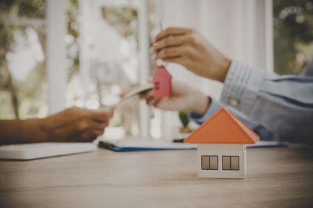 Real estate broker agent consult to customer to decision making sign insurance form and sending house model to client after approve, home model mortgage loan offer for and house insurance.