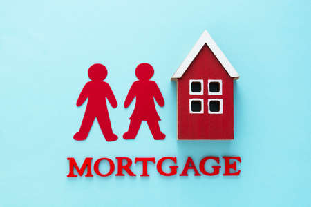 Mortgage word, wooden house and paper cuted man and woman. Home insurance. Rent, buy house. Blue background with copy space.