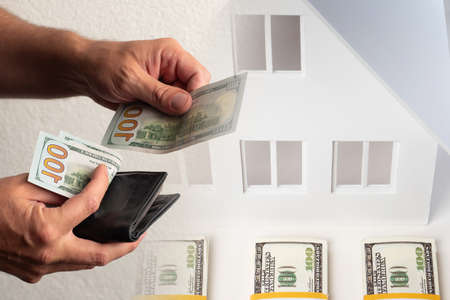 Layout of the building next to the money. A man piles up money next to the layout of the house. Mortgage. Buying real estate. Concept - home purchase savings. A man is saving money for his own house.