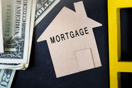 Mortgage text on brown paper house model with dollar banknotes on dark wooden table. Concept for loan, mortgage and refinancing.