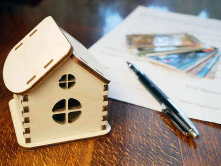 House model with real estate contract to buy house, insurance or loan and credit bank card real estate background, closeup