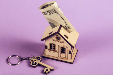 wooden small decorative house and paper money on purple background, copy space, sale and purchase of real estate concept. Real estate buying a house concept.