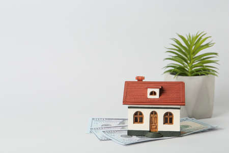 House model, money and houseplant on light gray background, space for text. Mortgage concept