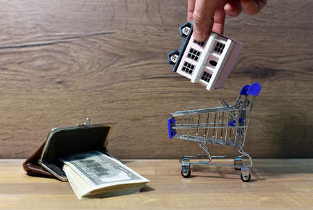 House in Supermarket Trolley and purse with american dollars. Home buying or selling. Credit housing or renting an apartment. Miniature Home for family with Hundred Dollar Bills. Real Estate Investing