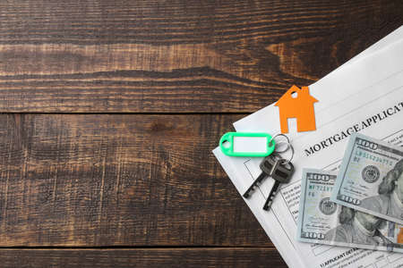 mortgage application. Key with house key fob and blank and money on a brown wooden table. concept of buying a home. top view