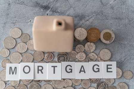 Mortgage concept. The word Mortgage on wooden cubes, a woman's hand puts coins next to wooden cubes.