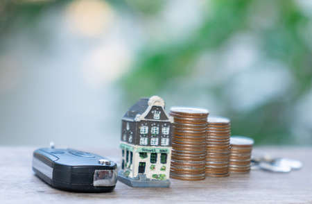 Coin stack and model house on wooden desk on green tree background. Saving concept for house and car.