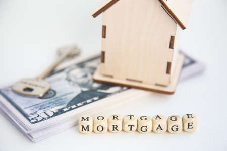 Concept of property, real estate and mortgage with a house model and wooden cube of a MORTGAGE word.