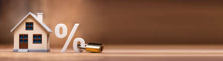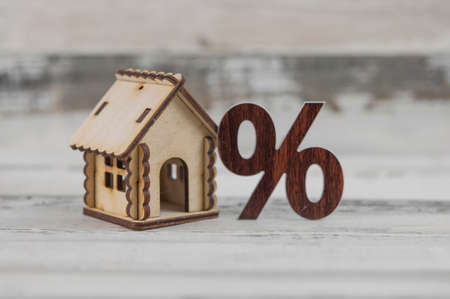 Relocation and house hunting concept. Model of wooden house with sign percent