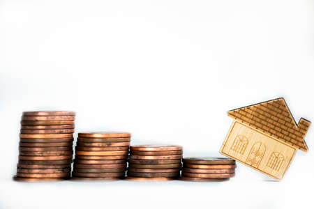 Several columns of coins and a small white paper house. Concept of buying a house, paying rent, providing home services.