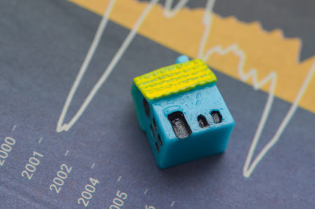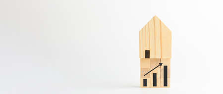 Real estate and home investment concept. Wooden model houses and graphs on cube wooden blocks, real estate growth in the future, finance, banking, lending, and trading.