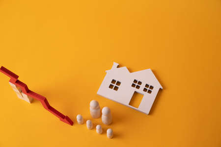 Wooden figurines of a family and a red down arrow next to a white house. The concept of reducing a housing loan to a young large family