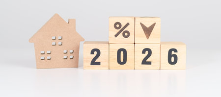 2026 New Year with percentage change to UP and Down arrow with Home model. Real estate Mortgage, Refinance, House loan and debt, Interest rate, Insurance, Financial and Property Tax