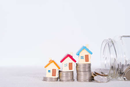 Mini house on stack of coins,Money and house, Real estate investment, Save money with stack coin, Mortgage concept.