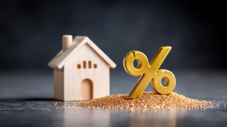 Gold percentage symbol beside wooden house on glittered surface expressing mortgage rate concept