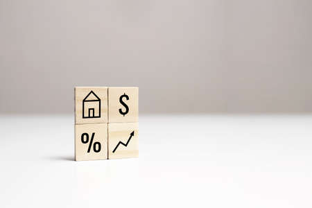 House, dollar, percent, arrow symbols on wooden blocks on table, copy space. Real estate property, mortgage concept. House value, building. Rising of pricing. Real estate investing. Growing statistic.