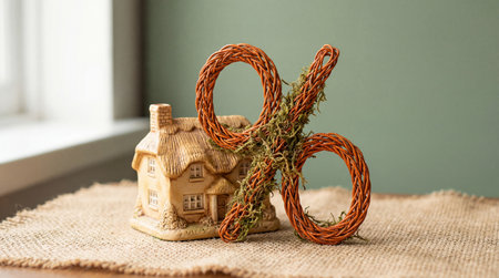 Miniature rustic house beside woven percentage symbol on burlap representing changing home mortgage interest and real estate investment.