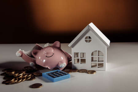 Broken piggy bank with coins and house model on a table