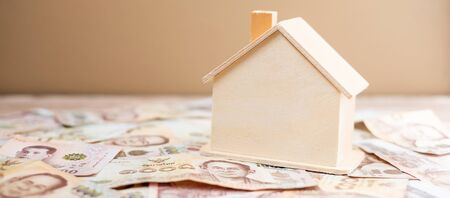 Wood house model, calculator and money, Thai baht banknote. real estate, Property investment, home mortgage financial and savings concepts