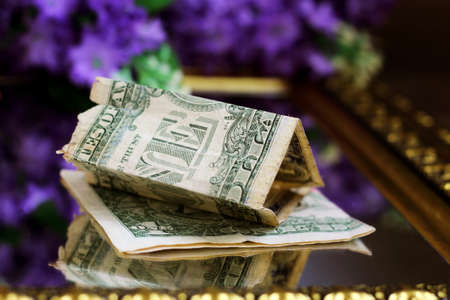 new dollar house, money building, isolated on wooden background