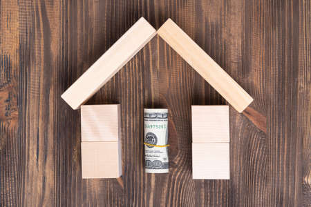 The concept of selling and buying real estate. Paper dollar bills rolled up inside a wooden house made of blocks, top view