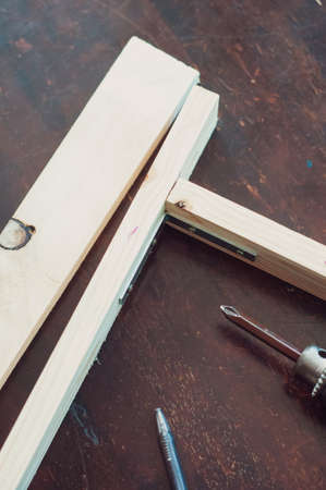 Close up. Carpenter work in the workshop. Woodwork and furniture making concept. Carpenter in the workshop marks out and assembles parts of the furniture cabinet
