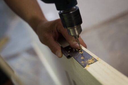 Drilling a hole in the furniture to install a lock on the door close-up.