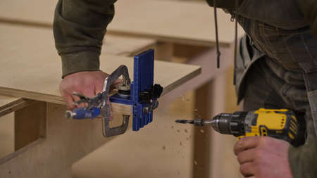 carpenter use drill bit and centering dowel jig tool to make strong joints . woodworking concept.selective focus.