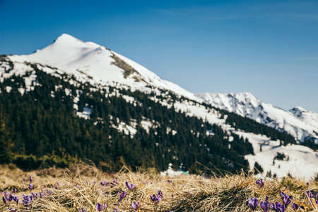 Purple flowers, snow-capped peak in the mountains on a background, spring