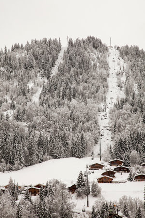 Picture of a cable ski lift cart in megeve town. French Alps in winter time, snow on trees.
