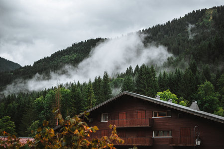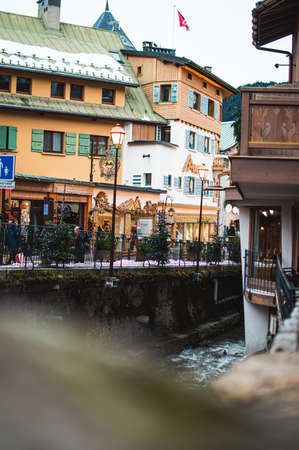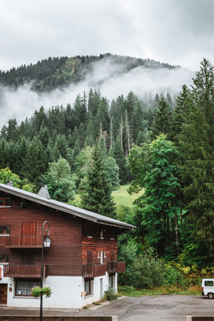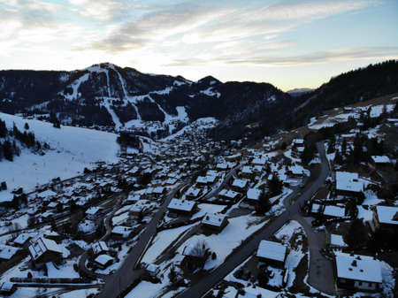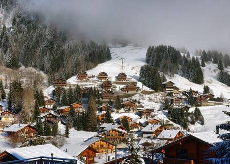 view of in mountain skiing resort town Les Gets in Portes du Soleil region, France