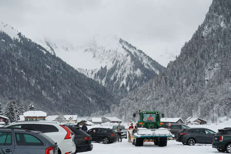 Studen, Switzerland 12 11 2021 Tractor with rear dozer blade assisting bring off cars in parking lot in cross country skiing resort in Switzerland surrounded by trees and snow capped mountains.