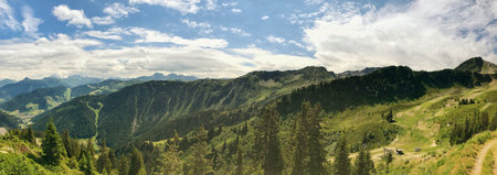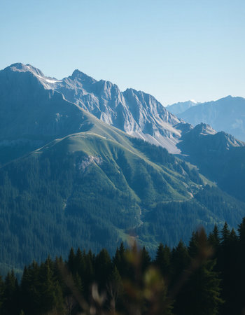 A breathtaking panorama of a green mountain range with forests and clear skies above. Captures the beauty of nature and tranquility experienced in a serene landscape filled with fresh greenery and scenic views.