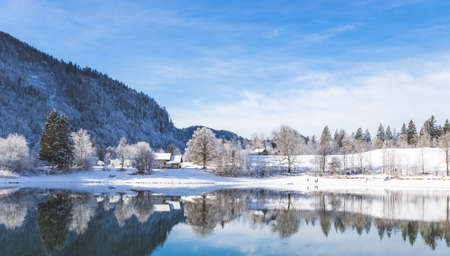 Idyllic winter landscape: Reflection lake, house and snowy trees and mountains