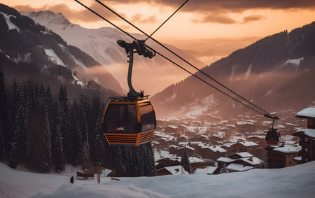 Cable car in the mountains at sunset. Ski resort in the Alps