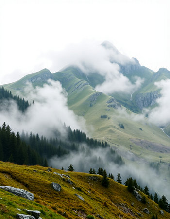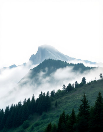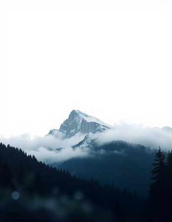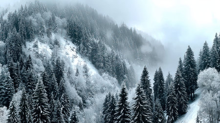 Majestic vista showcases steep mountain slopes densely packed with towering coniferous trees heavily laden with bright white snow, while thick, cool mist drifts through the upper reaches, creating a moody and serene winter atmosphere.