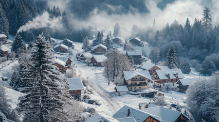 Aerial view of a charming village ensconced in snow with smoke rising from chimneys