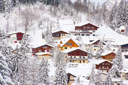 Snowy Mountain Village, Winter Wonderland in the Alps, Scenic Landscape View of Chalet Houses