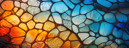 This stunning abstract image showcases a colorful mosaic created with stained glass pieces. The vibrant interplay of blue, purple, and orange creates a visually captivating effect.