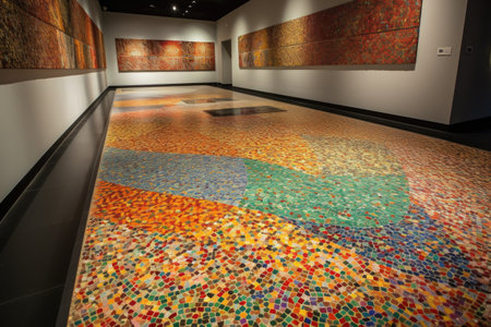 brightly colored mosaic tiles decorating the floor of a museum gallery, created with generative ai