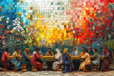 A detailed mosaic features an array of symbols and signs, each tile representing diverse cultures and ideas. The colorful arrangement captivates with its intricate designs and textures.