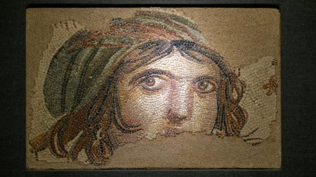 GAZIANTEP, TURKEY - OCTOBER 25, 2021: The Gypsy Girl Mosaic (Turkish: Cingene Kizi Mozaigi) in Zeugma Mosaic Museum. Gaziantep, Turkey. Biggest mosaic museum in the world.