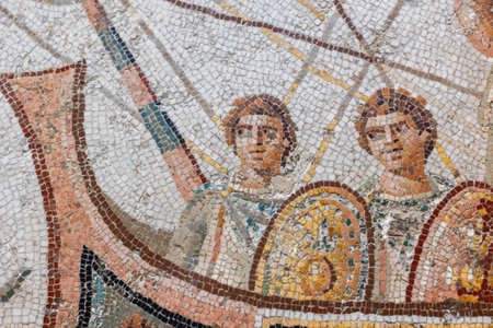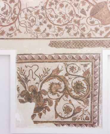 Gaziantep, Turkey - 18 October 2023: Close up of a mosaic art inside Zeugma Mosaic Museum