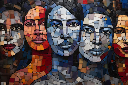 A creative mosaic mural composed of small ceramic tiles forming a row of human profiles with various skin colors ranging from brown to blue and white to represent international unity and art.